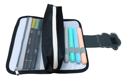Con tres compartimentos, ofrece un amplio espacio para lápices, bolígrafos y otros accesorios, facilitando el acceso a lo que necesitas en cada momento. Su material de tela garantiza durabilidad y resistencia, ideal para el uso diario en el colegio o en casa.