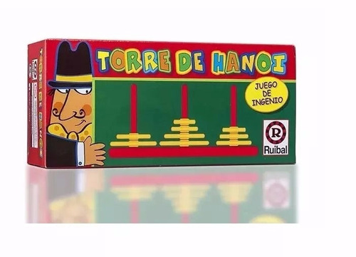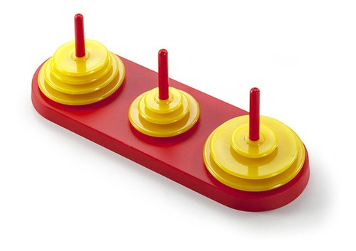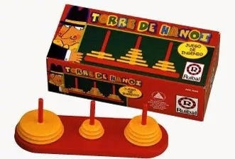 El objetivo es trasladar los diez discos desde un eje a alguno de los dos ejes restantes, moviendo solo un disco por vez. No está permitido colocar un disco mayor sobre uno menor.