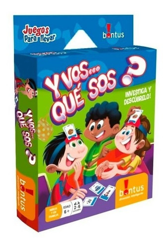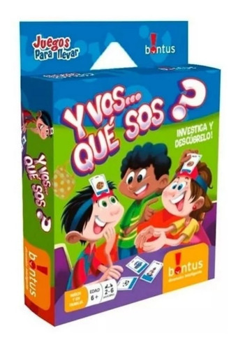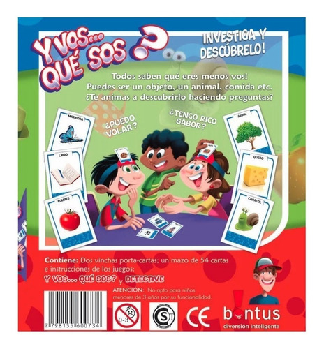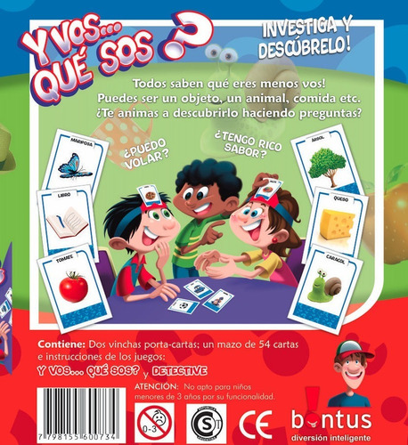 Dos vinchas porta-cartas, un mazo de 54 cartas e instrucciones de los juegos: “Y vos…qué sos?” y “Detective”