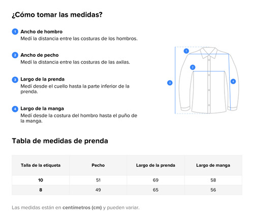 talle 10: 69 cm de largo x 51 cm en pecho x 58 cm en manga.