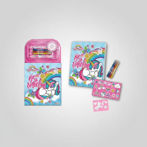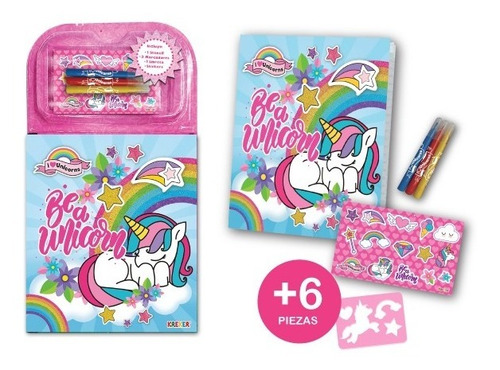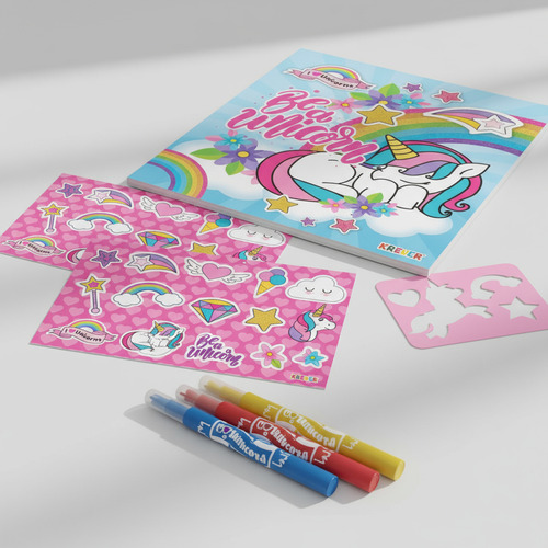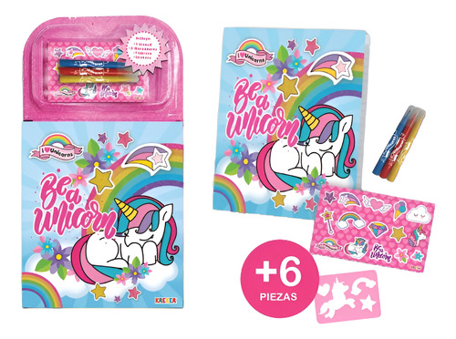 Incluye 6 piezas: 1 Libreta, 1 Stencil, 3 Marcadores y Stickers.